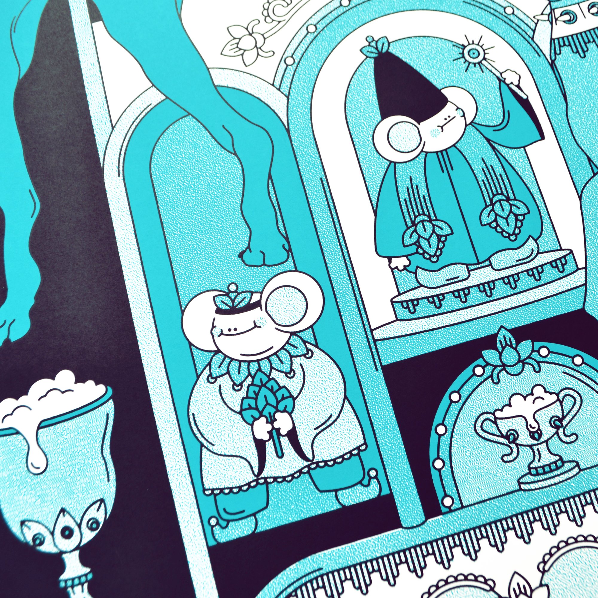 Affiche imprimée en sérigraphie, 2 passages ( Turquoise et noir).